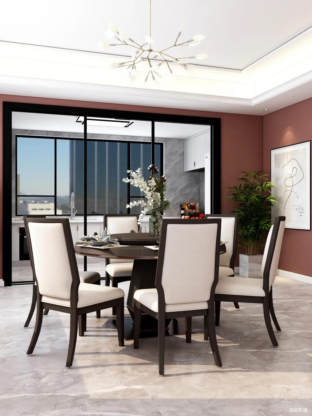 表姐不喜欢大白墙设计,于是设计师完美贴合表姐的喜好,摒弃了传统的大白墙,将色彩跳跃的铁锈红应用于空间,从视觉上丰富了空间的层次感。南北通透的空间布局,让视野更为清透明亮。