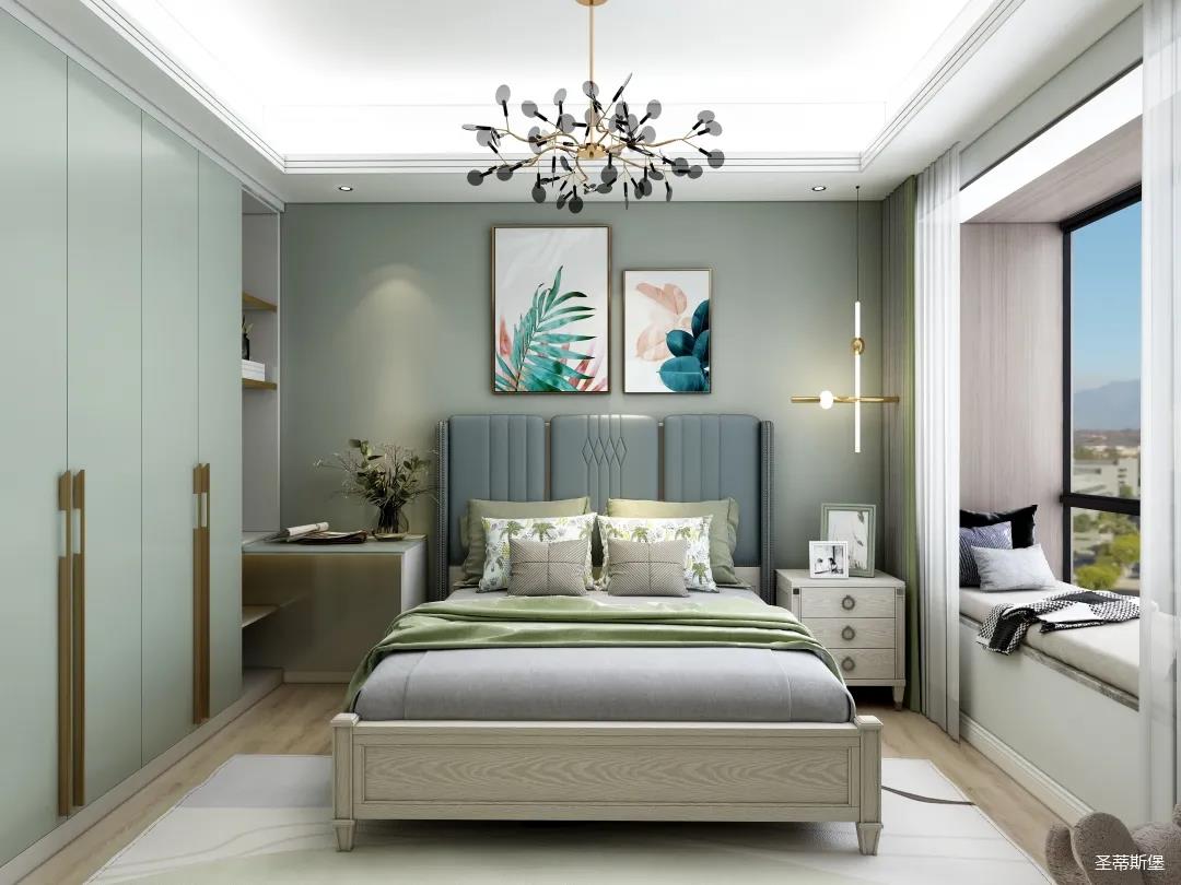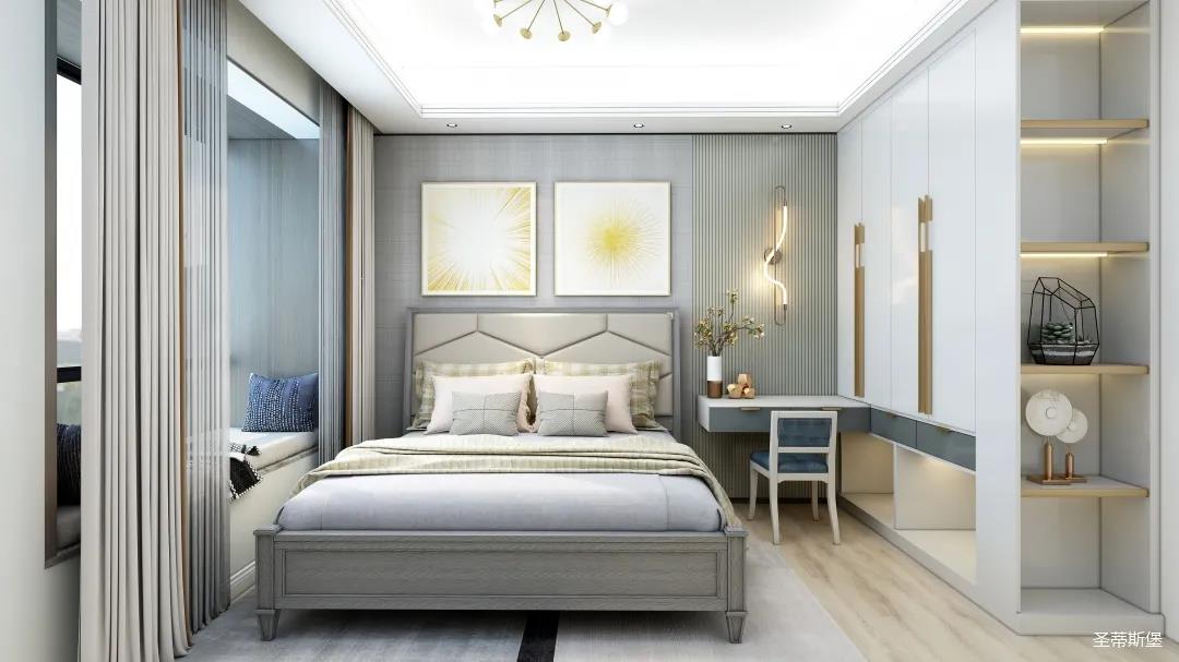次卧的设计充满治愈气息,表姐打算让两位老人居住。莫兰迪灰的实木感经典再现,沉稳中透着时尚,流露出精致的美式格调。舍弃刻意繁复的设计,简约米白背景墙与床屏产生的视觉延伸,提升了空间的舒展性。金属材质的灯饰,以较强的白炽灯为主,辅助照明,将对两位老人的关爱体现在细节中。