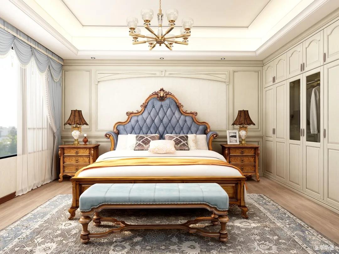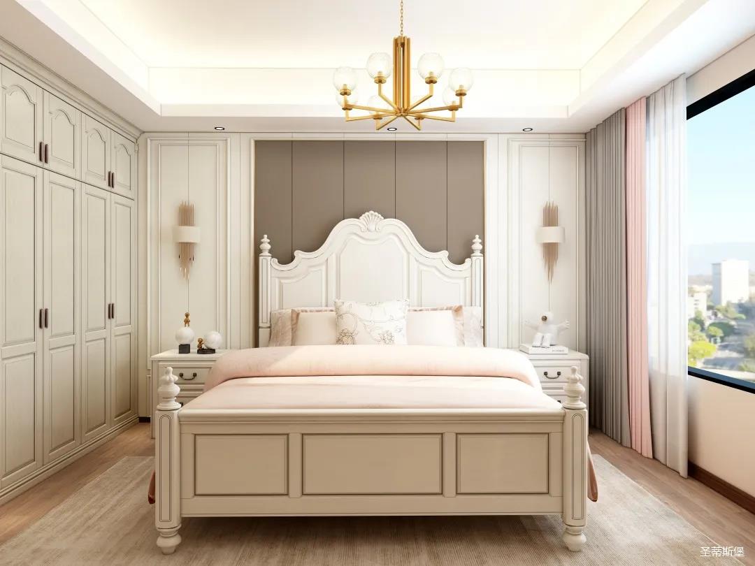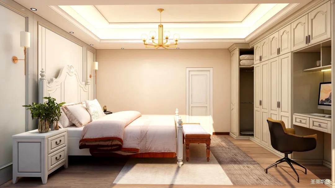 次卧的设计更注重收纳,人性化嵌入式书桌,整排衣柜设计有效的利用了空间每一个角落。床屏在保持原有美式家具特色的同时,增加了线条美,将繁杂的雕琢简化,并融入时尚的美式元素,壁灯,吊灯糅合自然光影,完美呈现出尊贵的空间格调。