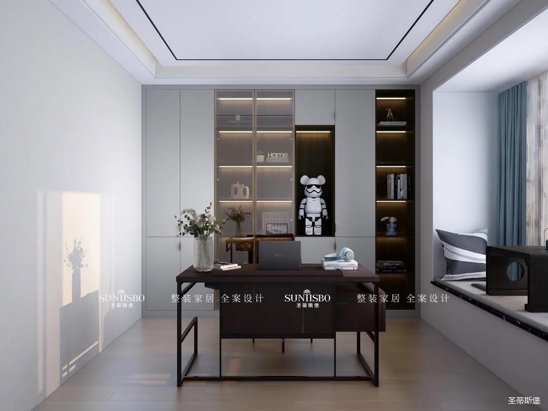阳光透过窗户悄然进入,光影浮动间,实木书桌给书房腾出了一个安静惬意的阅读空间,偶尔放下书本,径直探向窗外,慢享阳光里慵懒的味道。